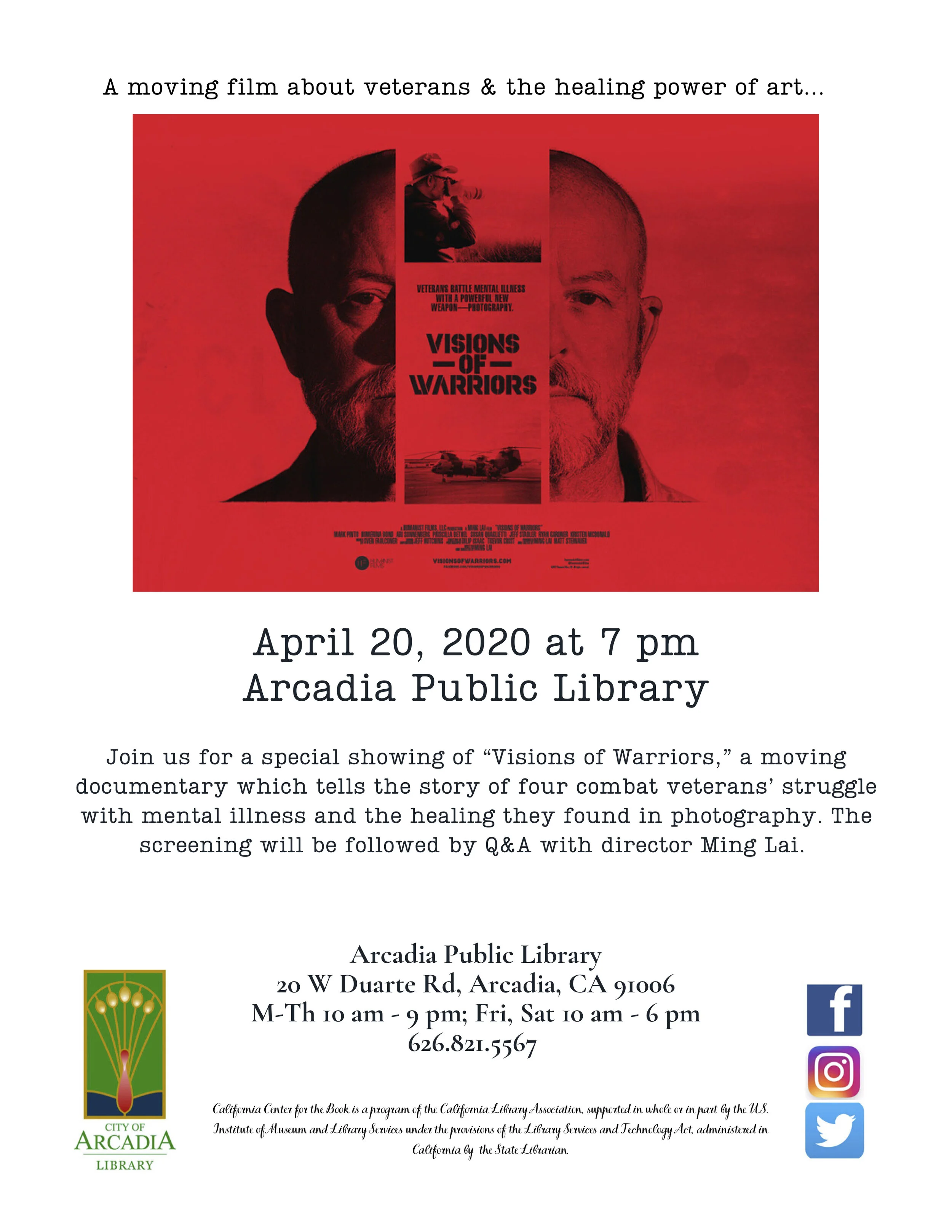 We’re pleased to announce that “Visions of Warriors” feature documentary will be screening at the Arcadia Public Library on Monday, 4/20/2020, from 7:00 p.m. to 10:00 p.m. Arcadia is part of the San Gabriel Valley of Los Angeles. Based in this diverse and thriving region, we’re proud to call it our home. It’s an honor to be able to share our film with its residents, in particular veterans and their families. This screening is made possible by “Community Conversations with Veterans,” a partnership between the California libraries and the respected California Center for the Book. The Arcadia Public Library’s community partner for the screening is the Gilb Museum of Arcadia Heritage, which will be unveiling a new Arcadia Veterans Kiosk. Thank you to Patricia Smith, the Arcadia Public Library, the Gilb Museum of Arcadia Heritage. Julianna Robbins, and the California Center for the Book for this great honor.